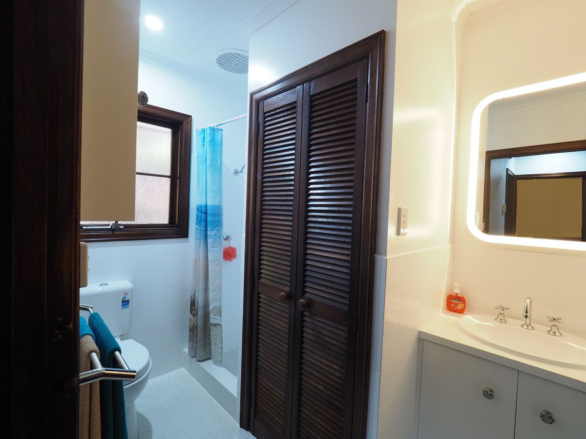 - one bathroom with heat lamps, lit mirror, vanity and linen press